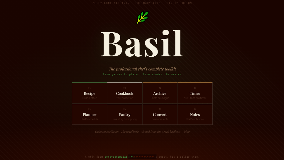From the teenager in Home Economics holding a knife for the first time, to the professional standing in a kitchen that serves presidents and kings — Basil covers the full distance. Every tool a culinary artist actually needs. Nothing that wastes your time.
