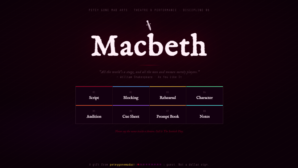 A name that carries weight should carry it all the way through. Every tool in this suite was built to reflect what the name demands — the precision, the discipline, the darkness, the beauty, the absolute seriousness of the craft. Theatre is the oldest collaborative art form on earth. It has been killed many times and has always come back, because the need for a body, a space, and an audience gathered in the same room at the same time to witness something together is not a cultural preference. It is a human requirement.