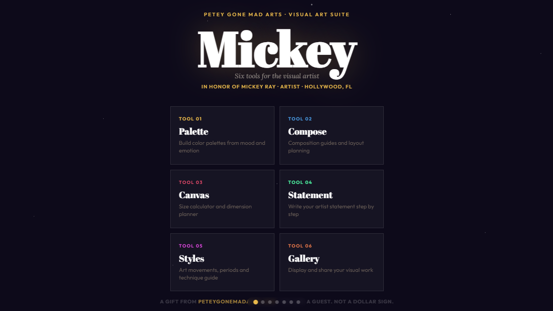 The aesthetic of this app was pulled directly from that canvas. The night sky. The star field. The crescent moon. The bold accent colors taken from Mickey Ray's own palette. This suite doesn't just carry his name — it carries his visual DNA.