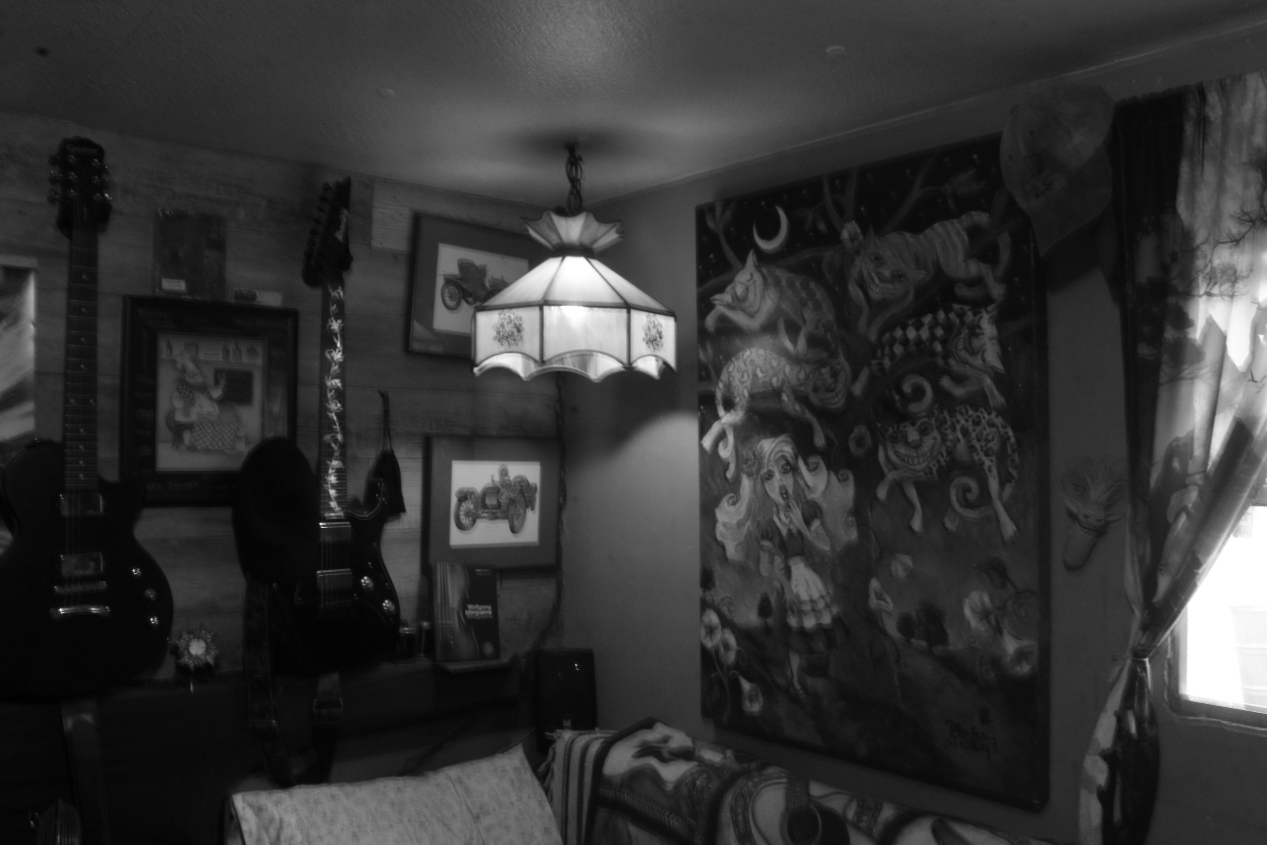 Named in honor of Mickey Ray — artist, Hollywood, Florida. Pete owns one of his paintings. Alice in Wonderland. Four Cheshire Cats, each in a different pattern — polka dots, stripes, checkerboard, leopard print — draped through a tree over Alice under a crescent moon and a full starfield. Fearless color. The kind of work that makes you stop moving and just look. Signed Mickey Ray in the bottom right corner. The painting hangs in Pete's home.