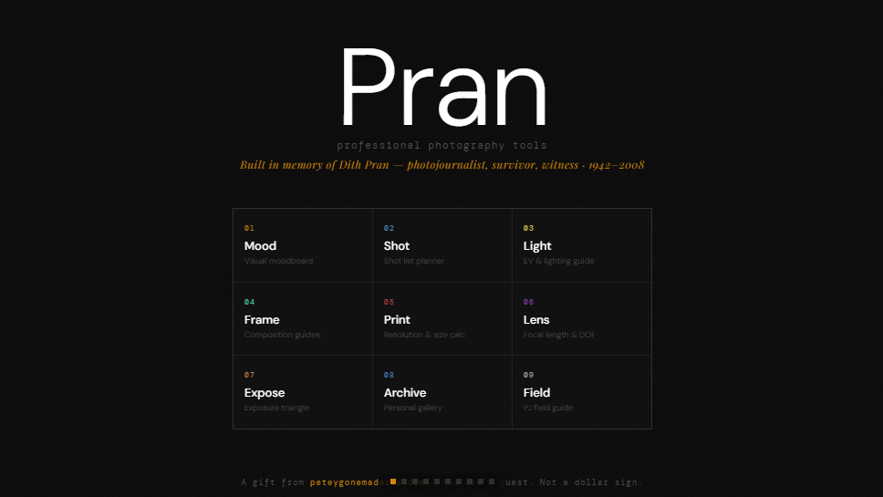 Named in honor of Dith Pran — Cambodian-American photojournalist, survivor of the Cambodian genocide, witness to history, 1942–2008. The Killing Fields was the first film Pete ever saw alone. It left a mark that never healed and never should have. Pran carries his name because the name deserves to be carried. So does the weight behind it.